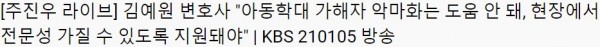 [제도 개선] 김예원 변호사 "아동학대 가해자 악마화는 도움 안 돼, 현장에서 전문성 가질 수 있도록 지원돼야… 페이지 정보 작성자 최고관리자 작성일22-07-12 13:27 조회1,043회 댓글0건 관련링크 https://www.youtube.com/watch?v=A30UVqDw1_g 656회 연결 이전글 다음글 목록 본문 https://www.youtube.com/watch?v=A30UVqDw1_g 이전글 다음글 목록